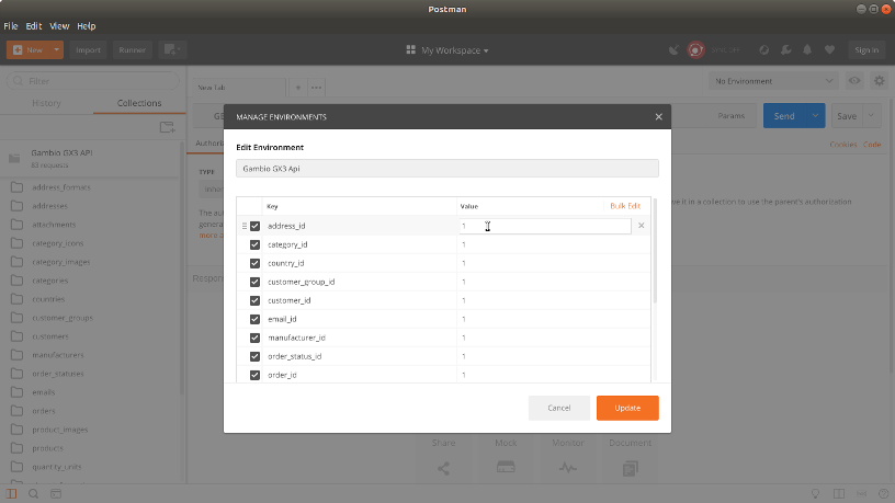 import the above downloaded environment JSON document (Gambio_GX3_api.postman_environment.json).
