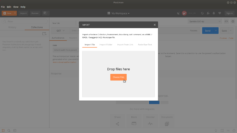 Postman enables you to define variables for most of the specified path parameters of the GX3 API. We have already composed a basic Postman environment which you can import, thus saving you of writing boilerplate configuration.