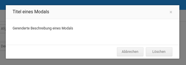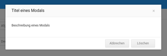 content: References the HTML file that is to be rendered.buttons: Defines the available buttons.close,delete: Name of the available buttons.action: (Optional) Defines the AJAX action that's triggered after clicking the button. If this attribute is missing, the modal will be closed after clicking the button.controller: (Optional) Defines the controller class that is to be called.method: (Optional) Defines the method of the controller class that is to be called.message: (Optional) References the text phrase for the success message that is to be shown.
